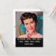 Tarjeta de felicitación plana cursi, divertida y un poco sarcástica con una mujer ama de casa al estilo vintage de los años 50 con el texto "La felicidad viene de la paz interior. La paz interior viene del vino". En la parte posterior, texto personalizable que también se puede dejar tal cual: "Hoy puedes encontrar la paz interior que estás buscando"