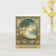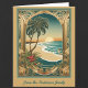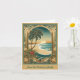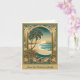 Esta tarjeta de felicitación navideña tropical plegable presenta una imagen tradicional de estilo art nouveau de un arco dorado con una palmera, playa y hermosa puesta de sol.