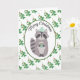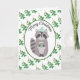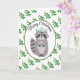 Este adorable mapache se mantiene caliente esta temporada navideña con su gorro de punto y una taza de cacao de Navidad. El fondo es un patrón de acebo verde con bayas rojas. Todas las áreas de texto se pueden personalizar.
