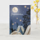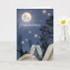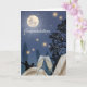 Una luna llena brilla intensamente sobre siluetas bailando bajo un cielo estrellado. Dos copas de champán están llenas de burbujas en primer plano. La tarjeta dice "Felicidades" en la parte delantera en caligrafía.