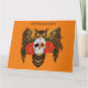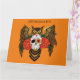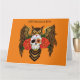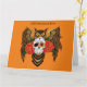 Un gran búho de cuerno pardo con un día de cráneo de azúcar muerto y rosas rojas sol un telón de fondo naranja