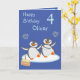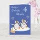 Una tarjeta única que puedes personalizar, mostrando una rebanada de Pastel de Cumpleaños y Velas, un par de pingüinos bailarines y fuegos artificiales. Personalizar con el nombre y la edad y el mensaje dentro se puede agregar o quitar siguiendo el mensaje "personalizar esta plantilla".