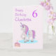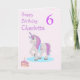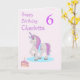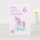 Una tarjeta linda que puedes personalizar mostrando una rebanada de pastel de cumpleaños y velas y un lindo unicornio. Personalizar con el nombre, la edad y el mensaje interno se puede agregar o quitar siguiendo el mensaje "personalizar esta plantilla".