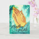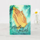 Tarjeta de saludo doblada con manos rezando con fondo azul abstracto. El interior es azul, se deja en blanco para tu mensaje e imágenes motivacionales. Tiene un tamaño pequeño y estándar.