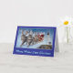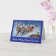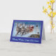Un equipo de Maine Coons con cuernos conduce a Santa y su trineo al cielo con un faro al fondo.