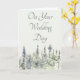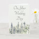 Esta tarjeta de felicitaciones de boda para la feliz pareja tiene una escena boscosa tranquila con una simple ilustración de estilo acuarela de altos árboles de hoja perenne. Los pinos de montaña están en tonos suaves de verde y gris. La letra verde coordinada deletrea tu elección de mensaje. El mensaje en el exterior y en el interior de esta tarjeta está listo para que lo personalices con tu propio saludo o crees una tarjeta personalizada única para cualquier ocasión.