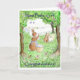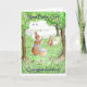 Una tarjeta de felicitación "Recién nacido Chica" con un conejo colgando la ropa en la fila y un grupo de conejos más pequeños admirando el nuevo arribo a su presa. De una acuarela pintada a mano por Judy Adamson. En blanco para tu propio mensaje.
