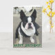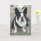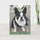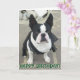 Tarjeta de felicitaciones que ofrece un retrato de un perro de Boston Terrier. El texto delantero lee "feliz cumpleaños", texto interior lee "esperanza que usted tiene un gran día!" El texto puede ser modificado para requisitos particulares.