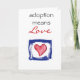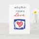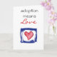 esta bonita tarjeta de felicitaciones por adopción es de una pequeña rana por dos flores. La adopción es para siempre.