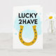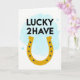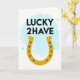 Esta tarjeta presenta una herradura dorada centrada en un fondo blanco, su tono amarillo cálido dando a la escena un brillo amistoso y acogedor 💚. Encima de ella, las palabras “LUCKY 2HAVE” están apiladas en letras mayúsculas negras, sentadas ordenadamente sobre la herradura como un titular confiado. Un suave lavado de azul cerúleo flota detrás del texto superior y la curva superior de la herradura, como una ligera nube que flota a través de un cielo tranquilo. Pequeños puntos azul oscuro corren a lo largo de la herradura como marcas de remaches ordenadas, agregando un detalle arraigado que equilibra el dorado soleado. Círculos azules más tenues y translúcidos se dispersan alrededor del lavado azul, como burbujas que suben y flotan, lo que hace que el espacio se sienta aireado y cercano. La disposición simple deja mucho espacio en blanco, permitiendo que la herradura y el mensaje se sientan como si estuvieran destinados a alguien que tienes suerte