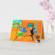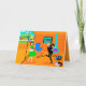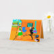 Esta tarjeta de felicitación personalizable para padres retro felices muestra a una mamá y un papá regocijándose mientras su hijo se apresura hacia el autobús escolar. La pareja que celebra está en su sala de estar al estilo de la década de 1960, de estilo moderno de mediados de siglo. El decorado naranja es cualquier cosa menos discreto. Hay una chimenea cónica de color turquesa y una silla huevo brillante y azul contra una pared de piedra naranja. En la pared, hay una impresión en lienzo estirado de arte de globo terráqueo de mediados de siglo, disponible en la propia tienda Zazzle de StrangeLittleOnion. En el suelo, hay un tocadiscos portátil azul y negro con varios álbumes de vinilo esparcidos cerca. Papá lleva un traje negro con una camisa de vestir azul claro y corbata azul más oscura. Está mostrando todos sus mejores movimientos de baile, del tipo que harían que su hijo pusiera los ojos en blanco. Mamá lleva un vestido verde vibrante y un delantal blanco con volantes y ribetes azules. Está parada frente a puertas de vidrio corredizas agitando alegremente mientras su hijo corre por la acera hacia el autobús escolar amarillo que espera. A través de las puertas, podemos ver su césped suburbano perfectamente cuidado y la proverbial cerca blanca. Incluso el fondo parece feliz con un cielo turquesa y las siluetas de árboles de cedro. El interior de la tarjeta tiene un fondo naranja con dos estallidos amarillos que rodean las