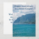 Un hermoso paisaje de playa hawaiana para extender felicitaciones de aniversario a una pareja especial en tu vida. Puedes cambiar fácilmente la redacción si lo deseas. El texto azul elegante actualmente dice, "Feliz Aniversario a una Dulce Pareja" en la parte delantera y "Deseándoles mucha alegría en los años venideros" en el interior.