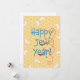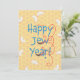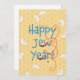 Una tarjeta de Rosh Hashaná con un juego de palabras que desea un Feliz Año Judío con shofars, panal de miel y rodajas de manzana.