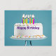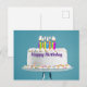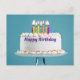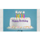 Una hermosa tarta de cumpleaños decorada con velas de colores encendidas en la parte superior, sobre un fondo azul suave.