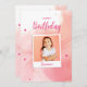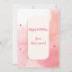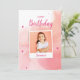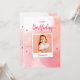 Este diseño es una tarjeta de cumpleaños festiva que presenta una imagen alegre de una niña sonriente. El fondo tiene una textura de acuarela rosa con motas doradas y estrellas flotantes, lo que añade un toque caprichoso y de celebración. Las palabras "Feliz Cumpleaños" se muestran de manera prominente en una fuente cursiva y juguetona, lo que la convierte en una tarjeta ideal para expresar cálidos deseos de cumpleaños.