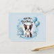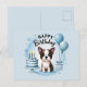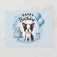 Haz su día especial perfecto con esta adorable tarjeta postal de cumpleaños de Boston Terrier. Con un dulce cachorro de Boston Terrier marrón y blanco, un pastel de cumpleaños azul a rayas, globos alegres y una caja de regalo, este diseño combina encanto y celebración en una tarjeta para guardar.