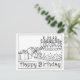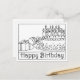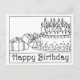 Este hermoso dibujo lineal en blanco y negro está listo para ser coloreado, para una forma única de DIY para celebrar un cumpleaños. Esta tarjeta presenta la frase "Feliz Cumpleaños" y una imagen de regalos, una tarta y velas.