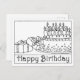 Este hermoso dibujo en línea en blanco y negro está listo para ser coloreado, para una forma única de DIY para celebrar un cumpleaños. Esta tarjeta presenta la frase "Feliz Cumpleaños" y una imagen de regalos, una torta y velas.
