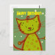 Celebra el cumpleaños de tu ser querido con esta adorable tarjeta que presenta una impresión moderna de un gato lindo de color verde, estilizado como un dibujo infantil. El diseño también incluye un texto en negrita que dice "Feliz Cumpleaños", que se puede personalizar según tus preferencias. Esta tarjeta es perfecta para aquellos que todavía se sienten jóvenes y aman a los gatos. Envía esta tarjeta a tu amigo, familiar o ser querido y hazles saber que estás pensando en ellos en su día especial.