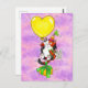 Un adorable gato marmoleado, que lleva un sombrero de fiesta y sostiene un ramo de flores blancas en una pata, y sostiene un regalo con su cola, está siendo elevado en el aire por un gran globo aerostático en forma de corazón amarillo. El fondo es rosa y morado como el cielo de una tarde.