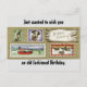 Increíble imagen vintage de un perro, pescando, jugando golf, patos y Feliz Cumpleaños en una tabla de madera, aparece en esta tarjeta de cumpleaños. La parte delantera de la tarjeta dice, "Sólo quería desearte un cumpleaños a la antigua". La parte trasera de la tarjeta dice, "¡Que tengas uno genial"! Un gran saludo de cumpleaños para enviar a un amigo o familiar masculino.