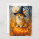 Tarjeta de Feliz Halloween y Otoño con Corgi Lindo, Calabaza y Bruja para Postcrossing