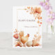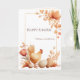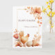 Una tarjeta de felicitación de Pascua cálida y encantadora que presenta un delicado marco floral y una dulce ilustración de un pollo.