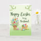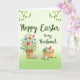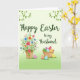 Esta tarjeta presenta el saludo “Feliz Pascua a mi Esposo” en letras verde oscuro colocadas en el centro de un fondo verde pálido, con pequeños acentos de vid que se curvan hacia las esquinas superiores. Debajo de las palabras, la escena se siente afectuosa y cercana, como si estuviera poniendo la mesa para un momento festivo tranquilo compartido entre dos personas. A la izquierda hay una maceta de terracota rebosante de flores en fucsia, azul cielo, naranja soleado y púrpura suave, metidas entre verdes frondosos y algunos toques 🌷. A la derecha, un tazón marrón cálido contiene varias formas de huevo lisas en esmeralda, lavanda, azul claro y amarillo dorado con rayas, lo que sugiere una dulce tradición hecha juntos 🐰. El suelo se desvanece en tonos verdes suaves, dando a los objetos un lugar suave para descansar sin líneas duras. Algunos huevos adicionales, algunos rayados y otros sólidos, están esparcidos cerca como pequeños sorpresas esperando ser encontrados. El campo verde pálido permanece abierto y aireado alrededor del texto central,