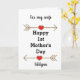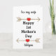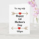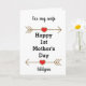 Una tarjeta feliz del primer Día de la Madre para esposa, que puedes personalizar fácilmente con su nombre. Características flechas brillantes con corazones. Dentro de esta tarjeta del primer Día de la Madre se lee un mensaje sincero, que también puedes cambiar fácilmente. La parte trasera de esta moderna tarjeta del primer Día de la Madre presenta la misma flecha y corazones donde puedes personalizar el año.