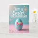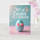 Esta tarjeta muestra un huevo grande de color azul pastel sentado en el tercio inferior, su superficie lisa salpicada de pequeñas manchas de confeti multicolor que añaden un ligero ambiente de fiesta 🌷. Una cinta rosa brillante rodea la mitad y se ata en un lazo ordenado, coronado con una sola flor similar a una margarita con un centro amarillo soleado, como un pequeño regalo ofrecido con afecto. El fondo cambia de un azul-verde calmado en la parte superior a un área suave de color rosa bebé cerca de la parte inferior, creando un entorno primaveral suave donde se puede imaginar un vínculo estrecho. Círculos de luz cálida y borrosa brillan en la zona superior, como luces de hadas distantes que vigilan la escena. Pequeñas piezas de confeti están esparcidas por el primer plano rosa, repitiendo los puntos en el huevo y manteniendo la celebración 🐰. En la parte superior, letras blancas y fluidas dicen “Feliz 1er. Pascua Bisnieta”, centradas y fáciles de ver contra los tonos más fríos. El lazo rosa y