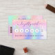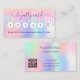 Un fondo holográfico de moda con colores unicornio y colores arcoiris en rosa, violeta, verde menta. Decorado con goteo. Al frente: Añade un descuento. Atrás: Personaliza y agrega tu nombre, título, número de teléfono, correo, dirección de sitio web, código qr a tu sitio web. Letras moradas. Sin goteo en la espalda.