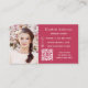 Un fondo magenta de moda, texto blanco Al frente: Añade un descuento. Atrás: Personaliza y agrega tu foto, nombre, título, número de teléfono, correo, dirección del sitio web, código qr a tu sitio web.