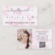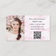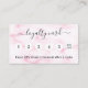 Rubor de mármol rosa como fondo, texto negro Al frente: Añade descuento. Atrás: Personaliza y agrega tu foto, nombre, título, número de teléfono, correo, dirección del sitio web, código qr a tu sitio web. Letras moradas. Sin purpurina en la espalda.