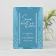Las hojas tropicales hacen un llamado moderno y cautivador para estas tarjetas de "guarde la fecha" de la boda. Cuenta con tonos de color turquesa. Utilice para complementar temas de boda tropicales y eventos especiales utilizando el azul turquesa como color focal. La parte trasera de la tarjeta dará cabida a una foto. También hay un código QR que puede utilizar para su sitio web de boda, RSVP, registro de boda (entre otros). Utilice la plantilla para personalizar.
