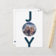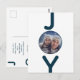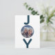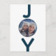 Una carta de Navidades minimalistas de moda en azul y blanco. En el frente: Un fondo blanco moda, con la palabra JOY escrita con letras en negrita rojas. La letra O se usa como marco fotográfico. Personaliza y agrega tu propia foto familiar. Fondo blanco y texto azul. Añade tus propios saludos y apellidos. Las letras de la palabra JOY como decoración.