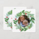 La obra de arte pintada a mano en acuarela adorna esta tarjeta de regalo de foto de corona de Navidad.