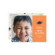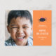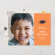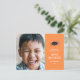 Diseño de Halloween moderno y lindo con una araña pequeña sosteniendo un trozo de dulce y colgando de una tela sobre un fondo naranja. Personaliza esta tarjeta con tu foto y texto.