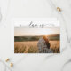 Tarjeta de foto de boda con caligrafía moderna y un mensaje pre-escrito en el reverso que dice Amor es paciente. Si tiene alguna pregunta, por favor contáctenos. Kimberly Brett.