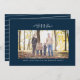 Esta tarjeta de vacaciones horizontal de una foto presenta un prominente monograma rodeado de ramas festivas rústicas y el año y un espacio para un saludo personalizable. La parte posterior presenta un fondo a rayas navy. El color azul navy se puede cambiar haciendo clic en "personalizar". Pegatinas de dirección coordinadas disponibles en la colección Rustic Monogram de Lea Delaveris Design. Este diseño es una forma perfecta de enviar alegría navideña junto con la mejor foto de tu familia.