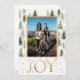 Un diseño elegante y festivo con un tema de color verde, dorado y blanco. Los árboles de pino verdes con purpurina dorada dispersa adornan una foto enmarcada para compartir con seres queridos. La palabra Joy añade un toque de alegría y sofisticación con una fuente clásica en un color dorado simulado. La parte posterior tiene un mensaje personalizable en texto negro con la palabra amor en un color dorado sólido.