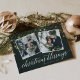 Elegante tarjeta de Navidad con un rico fondo verde cazador adornado con guirnaldas de luces de falso foil dorado en la parte superior. Agrega dos fotos cuadradas favoritas enmarcadas por un borde blanco. "Bendiciones de Navidad" aparece en la parte inferior en letra de caligrafía blanca, con el nombre de tu familia incluido en el diseño. Personaliza la parte posterior con una adicional y un saludo de Navidad personalizado.
