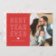 Envía a tus seres queridos una elegante tarjeta de foto de vacaciones esta temporada de fiestas. La tarjeta de foto moderna cuenta con un fondo rojo, la frase "Mejor Año de Todos los Tiempos" en una fuente de moda, espacios para tu texto personalizado y foto, y un patrón geométrico rojo y blanco en la parte trasera de la tarjeta.
