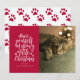 Este diseño de vacaciones para amantes de los gatos presenta la frase "Tengan una Navidad gatuna muy feliz" en una escritura blanca moderna con pequeñas huellas de patas blancas alrededor y un patrón de huellas de patas rojas y blancas en la parte posterior.
