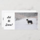 Esta tarjeta de foto muestra un colie fronterizo con nieve pesada y el texto "¡Que nieve!"