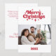 Un fondo blanco, texto rojo. Texto y foto al frente. Su texto y nombres en la parte posterior. Feliz Navidad se escribe con un tipo de letra de estilo retro.