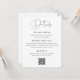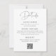 La moderna tarjeta de gabinete todo en uno para su ducha para bebés cuenta con tres campos de personalizado para obtener detalles adicionales; se muestra con un rifa de pañales, solicitud de libro y código QR del registro. Coordenadas de diseño blanco y negro minimalista de moda con nuestra suite de invitación a la ducha de bebé estilo Minimalista Modern Script.