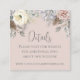 Tarjeta rosa de detalles de Rubor. Con blanco, plateado, marfil, Rubor rosado, flores azules y elementos de la tarjeta de detalles boda de la naturaleza. Hermoso, elegante y romántico flor pastel con toques de ramas de pino, bayas y conos de pino. Conecta tu tarjeta de detalle Boda en la invitación romántica de boda floral coordinada para una hermosa suite boda.