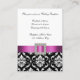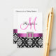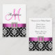 Tarjeta De Alojamiento De Recepción De Damasco Blanco Rosa. Elke Clarke©. Gráficos con licencia. Patrón elegante de damasco blanco y negro con una foto impresa de una cinta de satén rosada, broche cuadrado con foto impresa de diamantes blancos, monograma rosa inicial en la parte delantera y la información de la recepción de la boda en la parte posterior de la tarjeta. Personalizar con su información y monograma.
