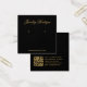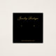 Una simple tarjeta de visualización de los pendientes en negro y oro: sólo texto dorado sobre fondo negro. El nombre está escrito en una elegante caligrafía bajo ella, los lugares de arenque indicados por dos círculos muy pequeños. El sitio web escrito cierra la frontera inferior. Hay más información en la parte de atrás, en la parte inferior. También tiene código QR en la parte posterior, a la izquierda de la información.