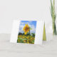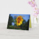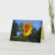 Una abeja de miel visita un hermoso girasol. En la parte trasera de la tarjeta hay un girasol alto en un campo de girasoles.